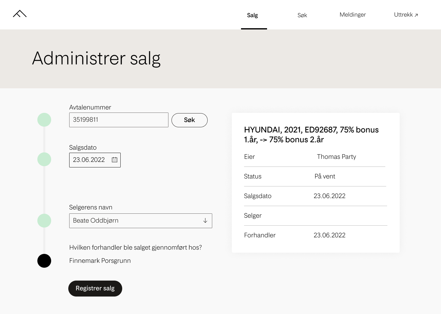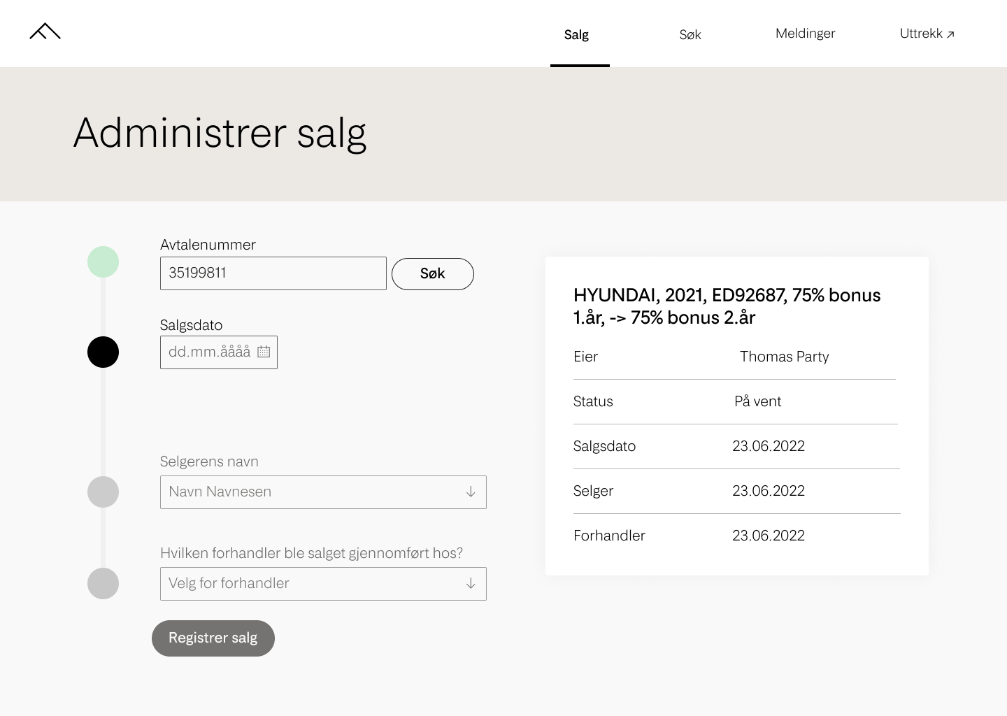 Målet med prosjektet var å utvikle en mer effektiv og brukervennlig løsning for å håndtere registrering av provisjoner til bilforhandlere. Den gamle løsningen var utdatert og manglet et gjennomtenkt design, noe som resulterte i en mindre optimal brukerreise. Målet var å skape et nytt og forbedret grensesnitt som ville benytte seg av Fremtinds designsystem Jøkul og samtidig endre informasjonsstrukturen for å gi brukerne en bedre opplevelse.