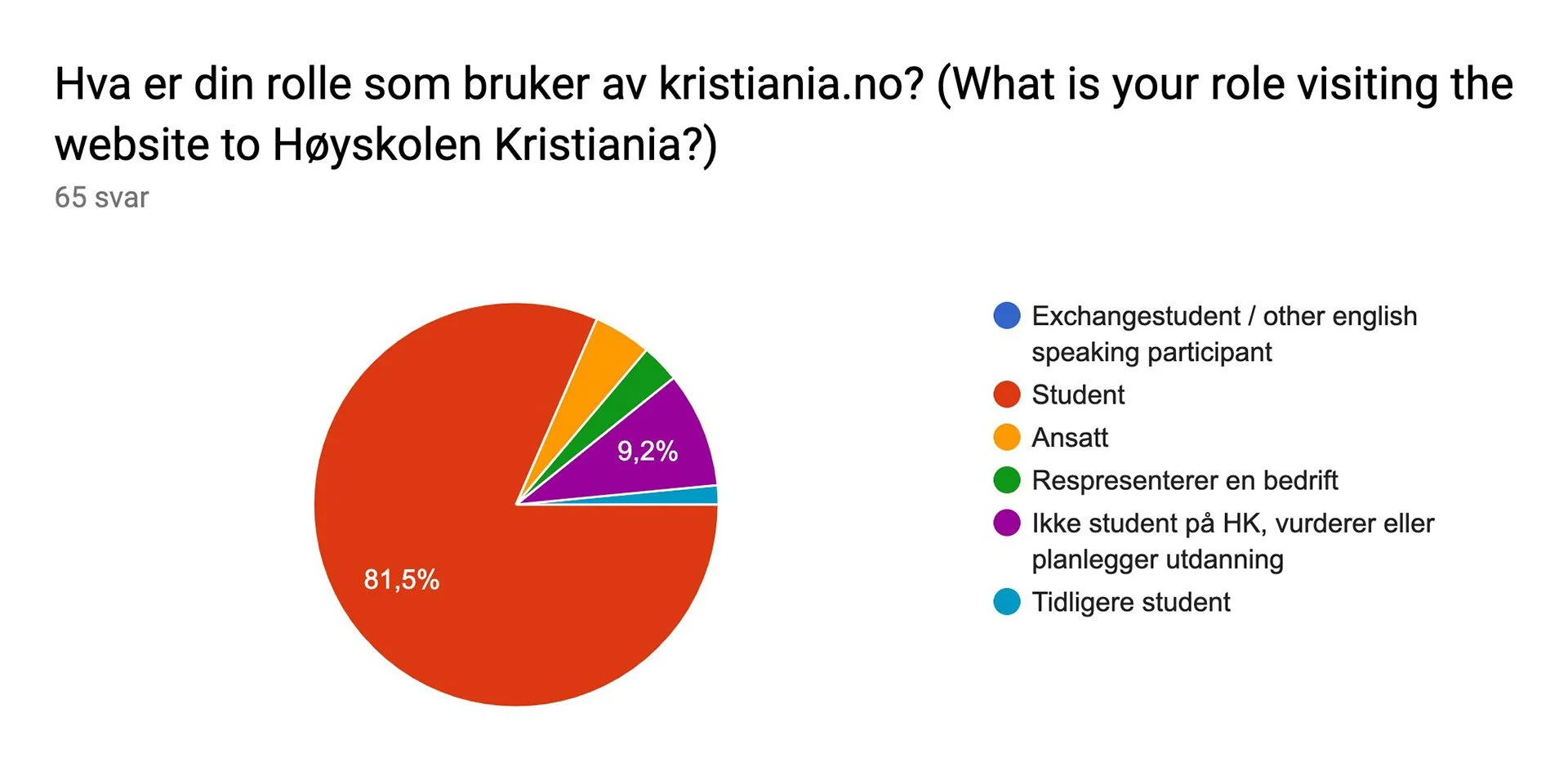 Fordelen med å bruke spørreundersøkelse i dette stadiet er muligheten å nå ut til mange uten å bruke tid på å oppsøke hver bruker. Det gjorde det mulig å kontakte mennesker uavhengig av geografisk lokasjon og få kvantitative data som ga en pekepinn på om funn fra kvalitet innsikt også gjelder i bredden. (Tone Nordbø 2017, s. 86). Vi sendte spørreundersøkelsen til direkte til potensielle studenter, nåværende studenter og lærere. Vi benyttet oss også av facebook-gruppen til Høyskolen Kristiania, der mange nåværende studenter svarte.
