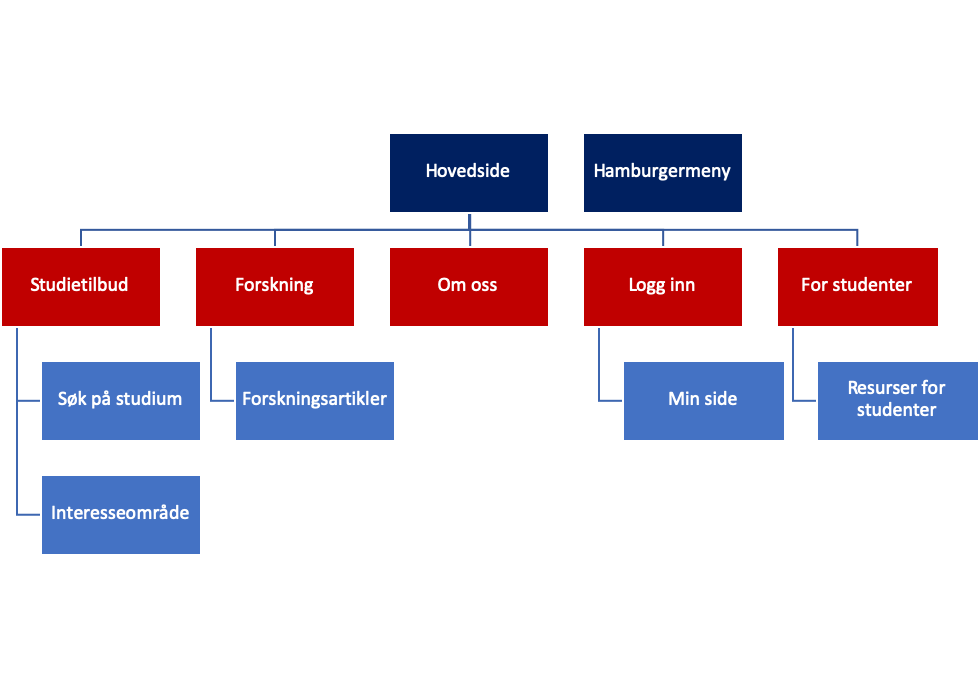 Som løsning på problemene som avdekkes i spørreundersøkelsen vil løsningen fra forsiden implementere hovedfordeling for å ikke utsette brukeren for unødvendig informasjon. Som nevnt er det mange som bruker google for å finne informasjon om skolen, og dette er målet vi vil at brukerne skal unngå. På forsiden skal det finnes en valgmulighet mellom: for studenter, studietilbud, eller forskning, da dette er av interesse for de prioriterte målgruppene. Dette for å unngå å skape irritasjonsmoment ved at brukeren går seg vill på siden.