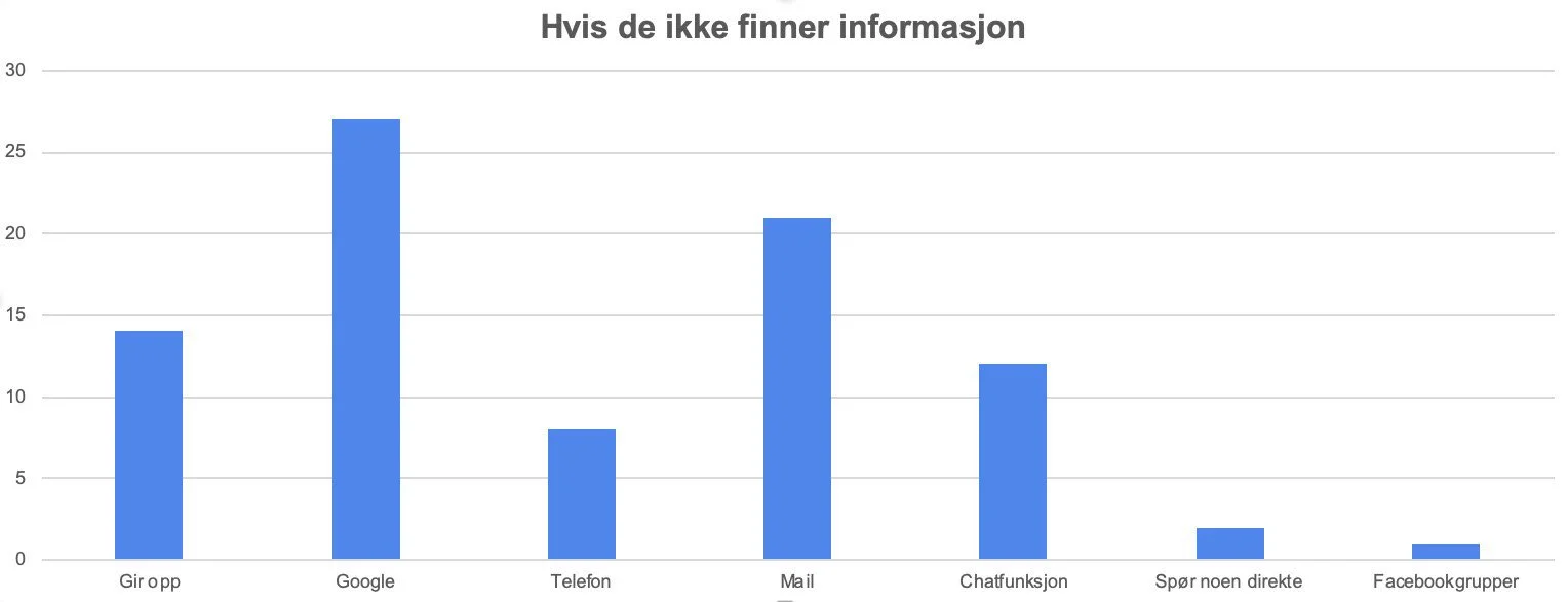 De fleste deltakerne svarte at de oftest bruker Google når det ikke finner det de søker, mange tar kontakt via telefon eller chat, men det er også en betydelig andel som gir opp. Dette bekrefter sannsynligvis teorien at mange studenter bruker Google mer enn nettsidens interne navigasjonssystem.