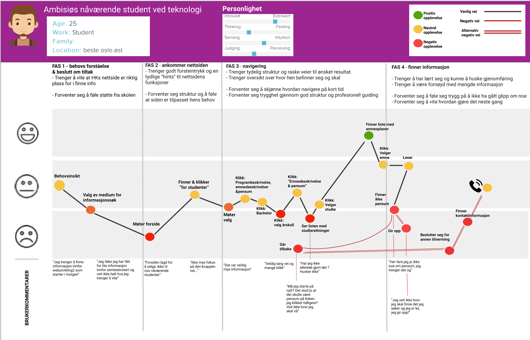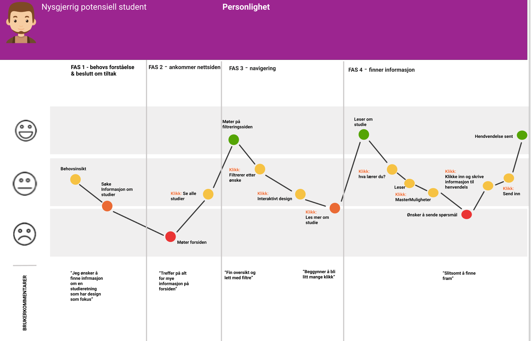 I brukerreisekartene som har blitt laget, har vi tatt utgangspunkt i den potensielle studenten og nåværende studenten. Brukerreisene har gitt oss en raskt og god oversikt over brukerens mulige handlinger og opplevelser på nettsiden kristiania.no.
