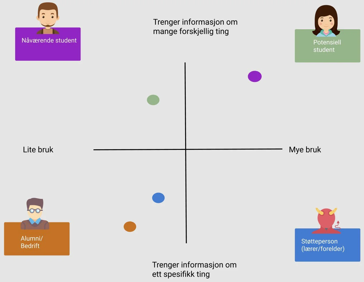 I og med at nettsiden blir laget for mange ulike grupper, der hvor alle muligens søker ulike informasjon, er brukerne som skal analyseres en stor og ikke homogen gruppe. Vi valgte å gruppere disse på følgende måte: