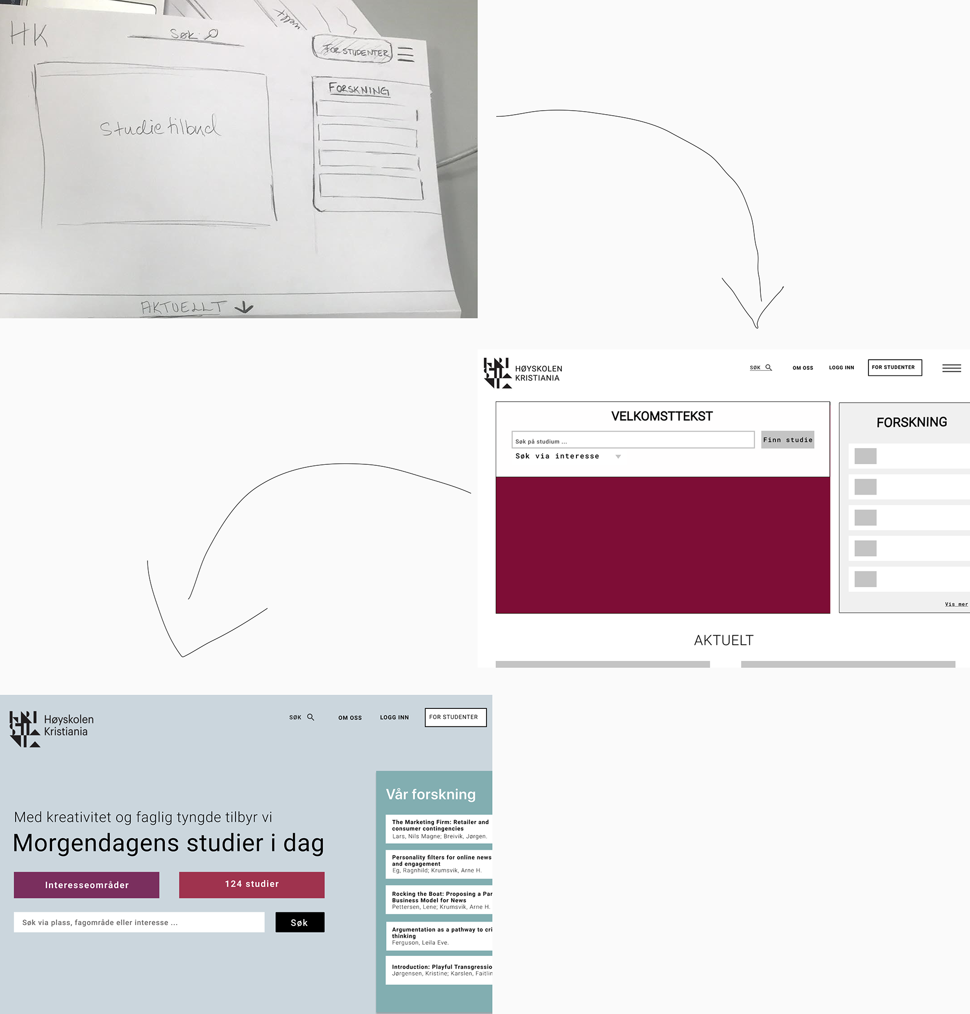 Disse versjonene er basert på den nåværende nettsiden og viser til problemområder vi ønsker å forbedre: hverdagslig info for nåværende studenter og bedre oversikt over studietilbud og informasjon om de ulike studiene for potensielle studenter og bedrifter.